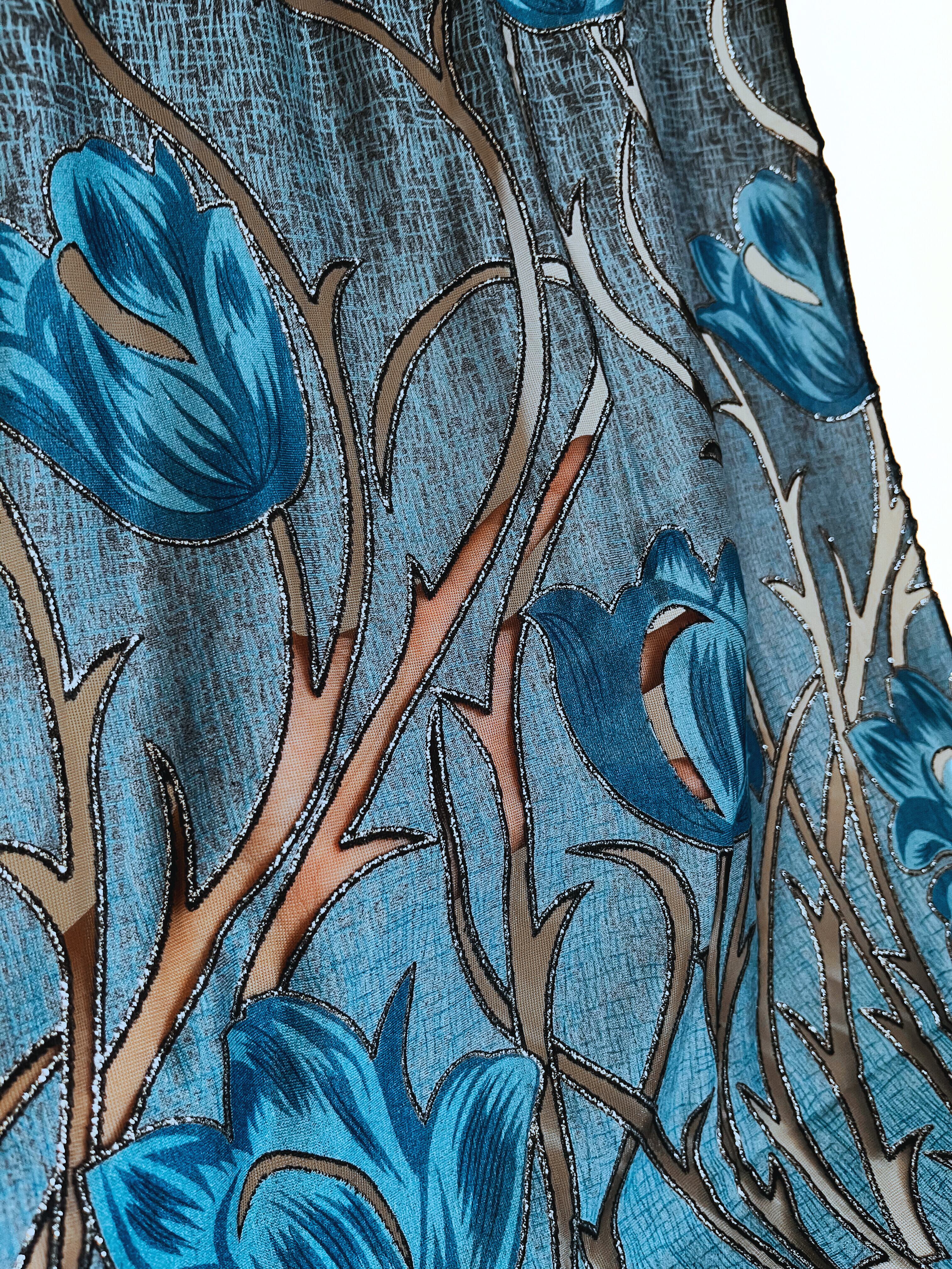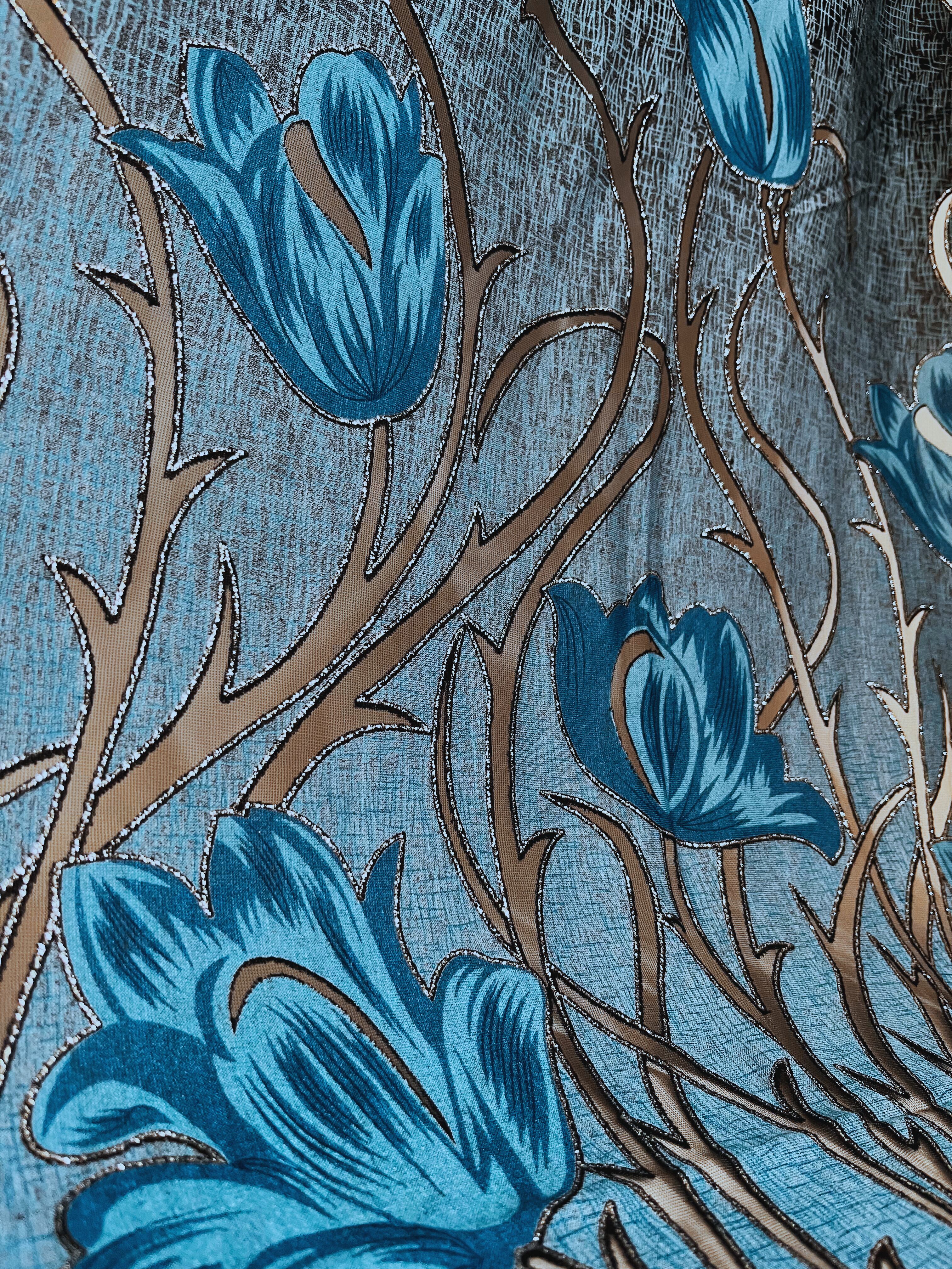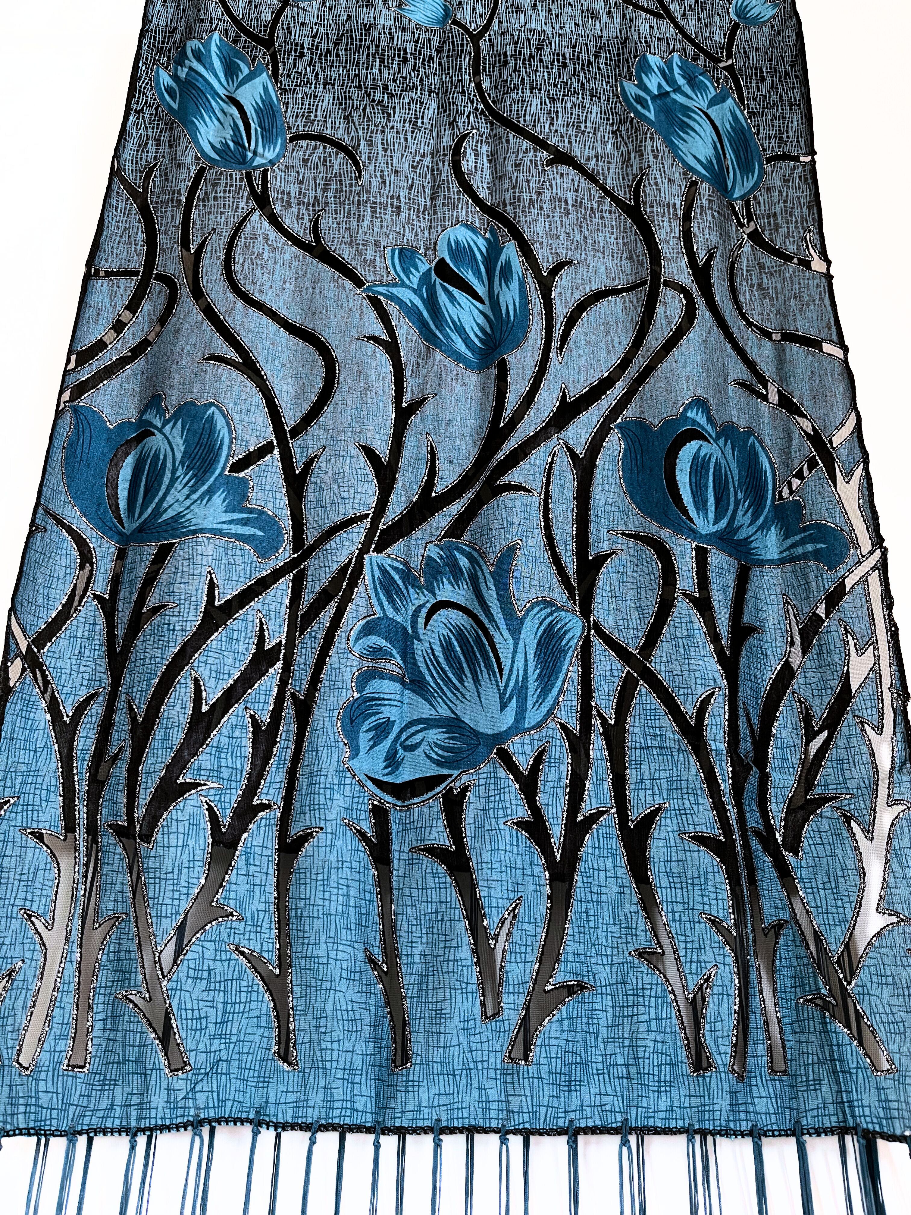 花の茎部分が黒色のレースで透け、柄の線にシルバーのラメ。