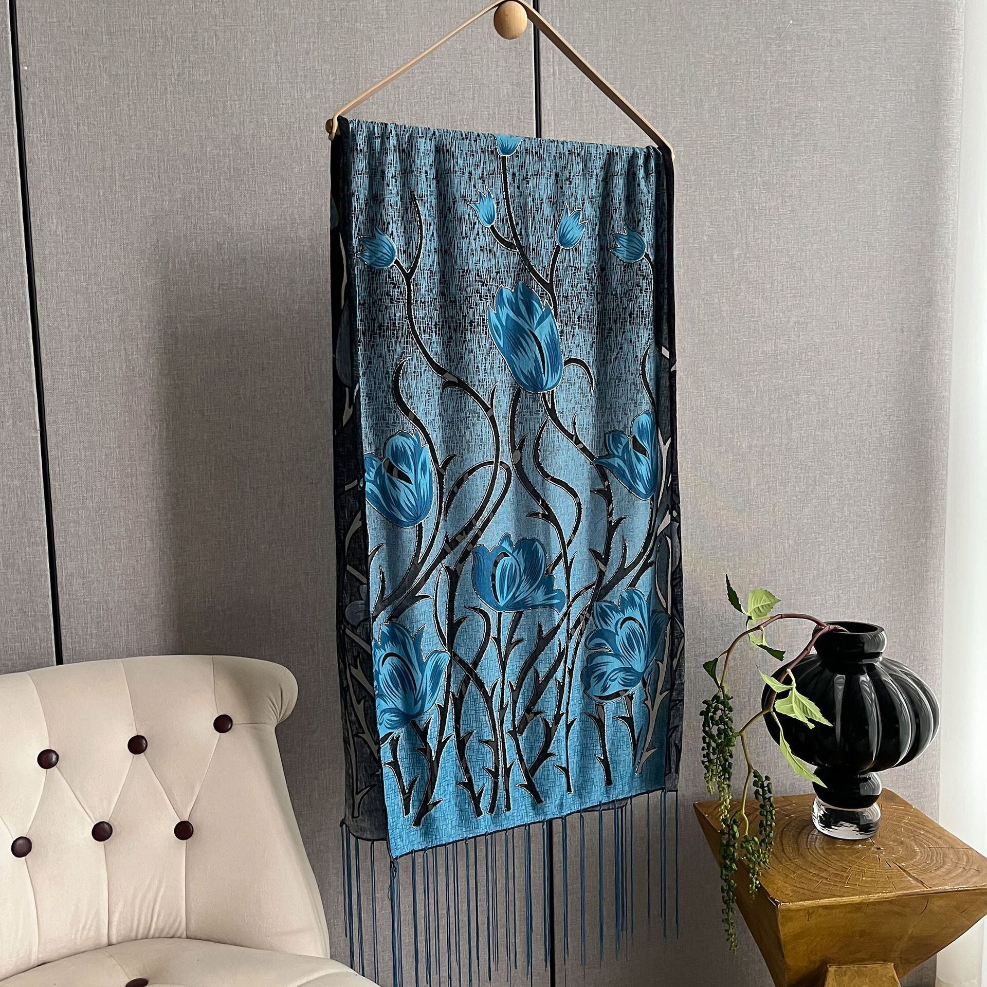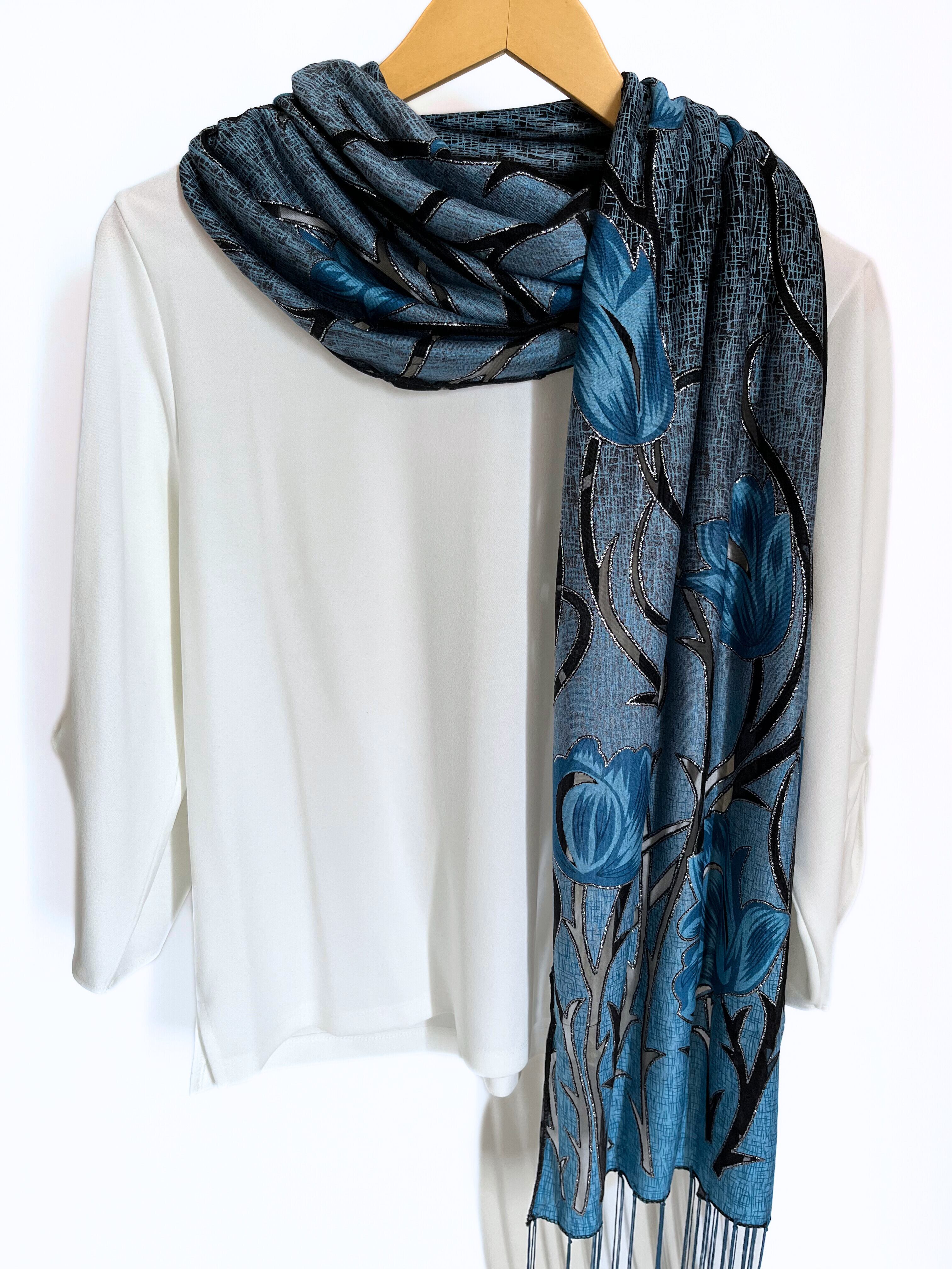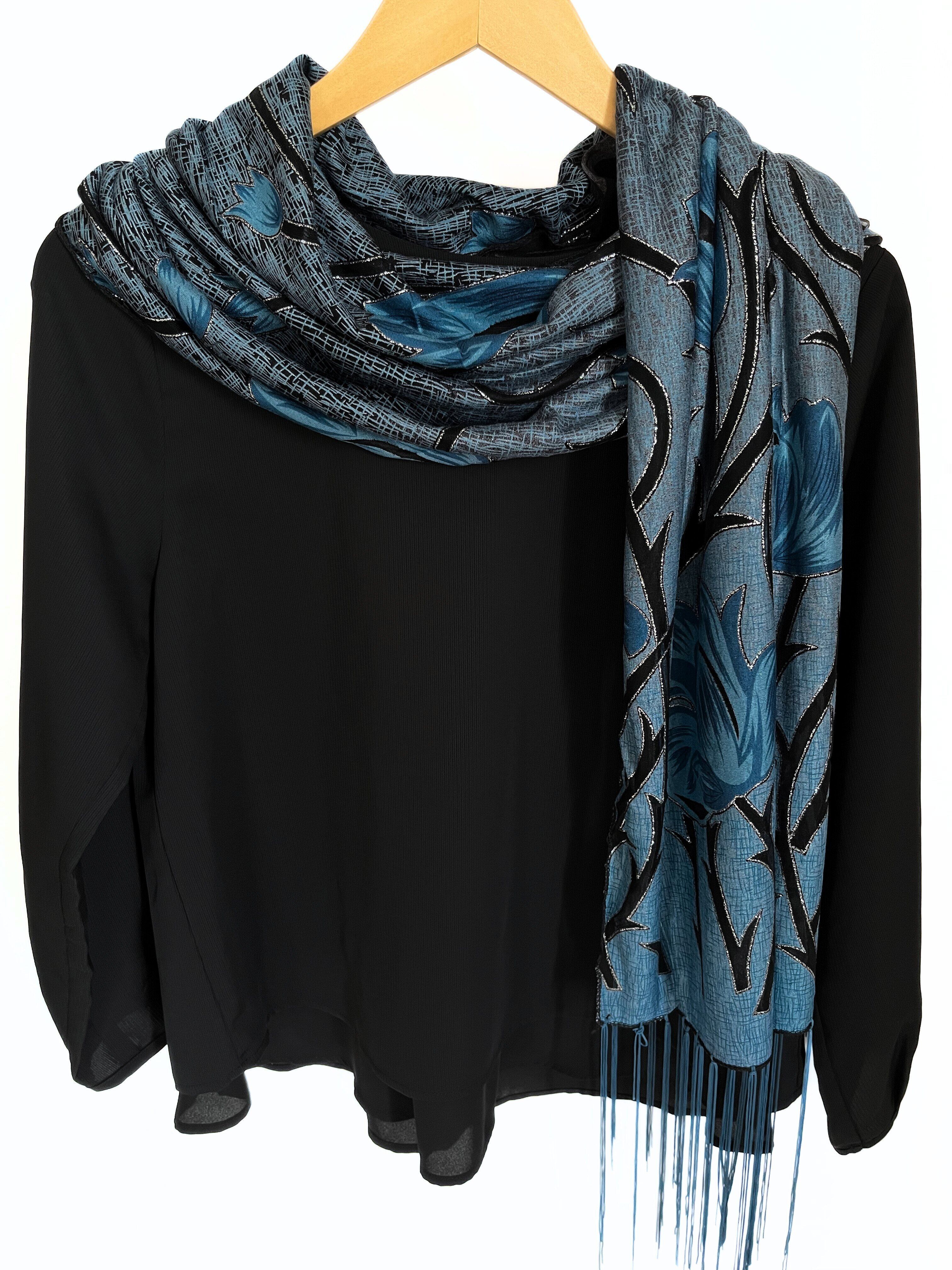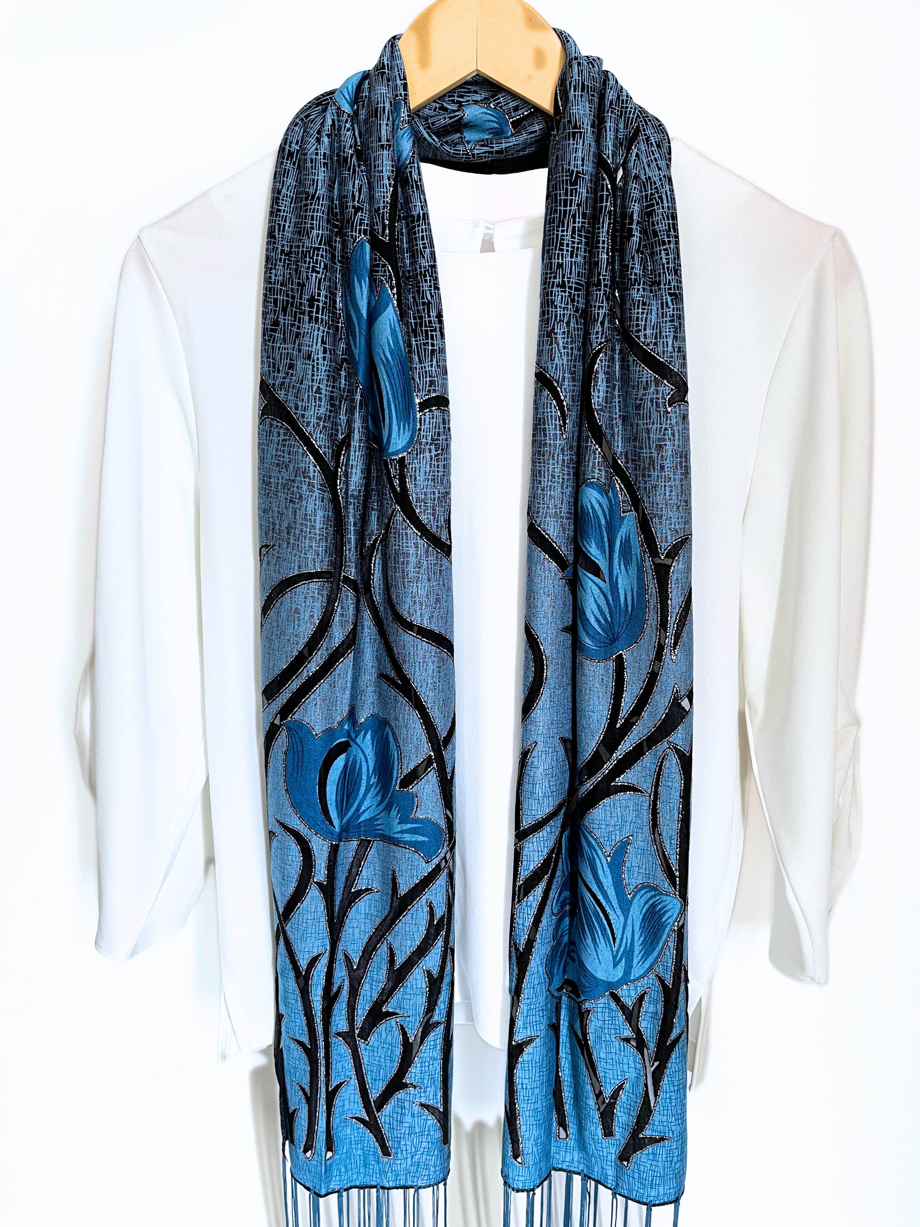 花の茎部分が黒色のレースで透け、柄の線にシルバーのラメ。