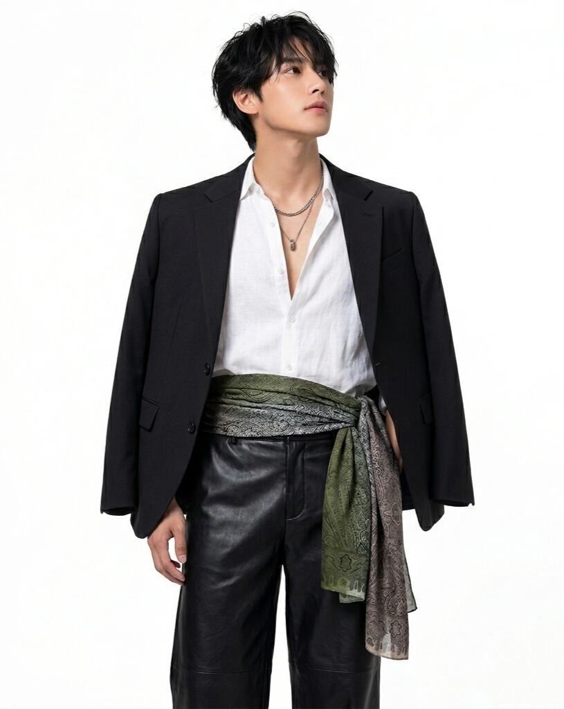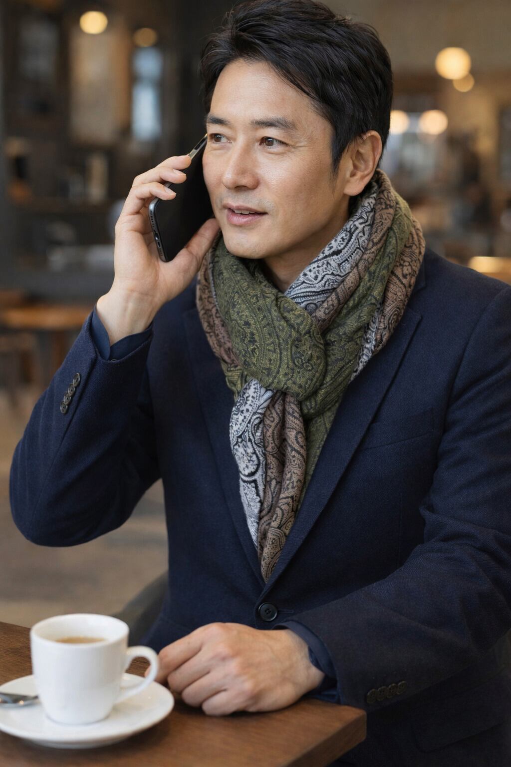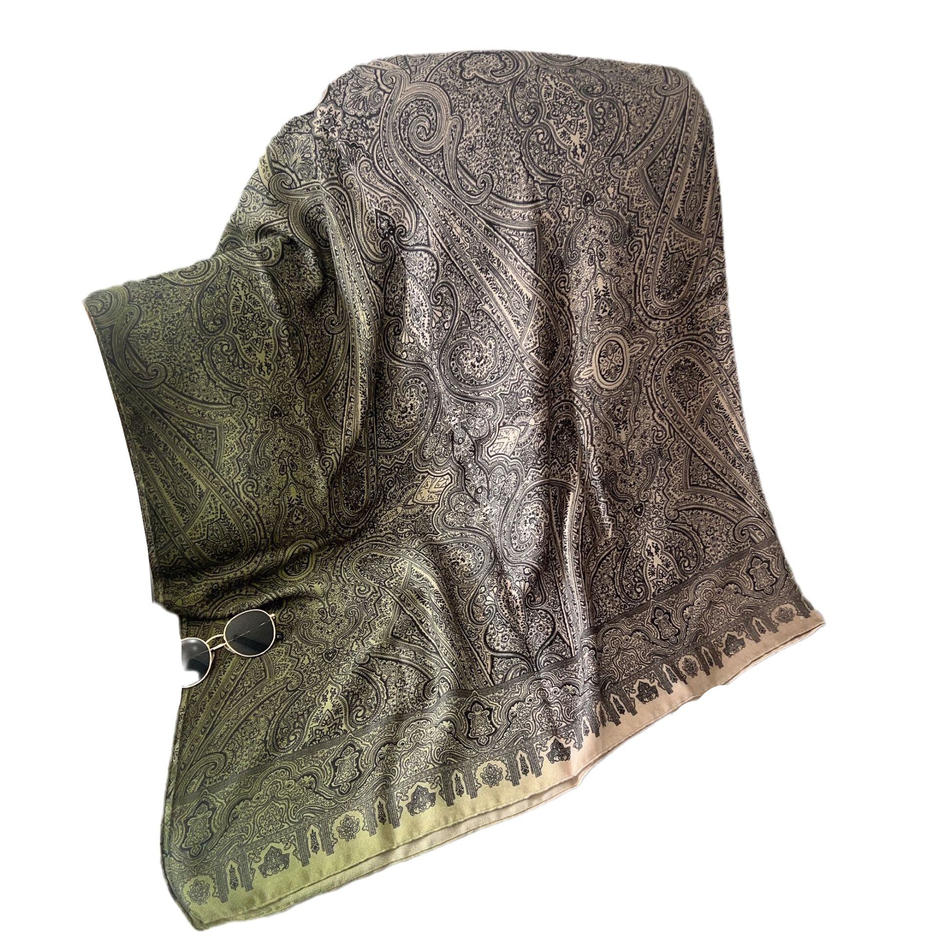 カーキ、ホワイト、ベージュへとグラデーションがとても綺麗で、ペイズリーの様な柄がカッコよくきめてくれます。