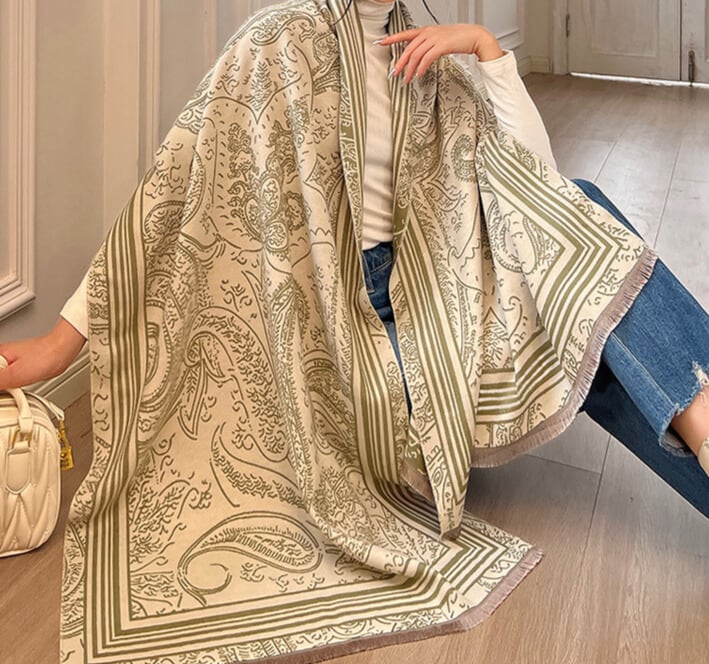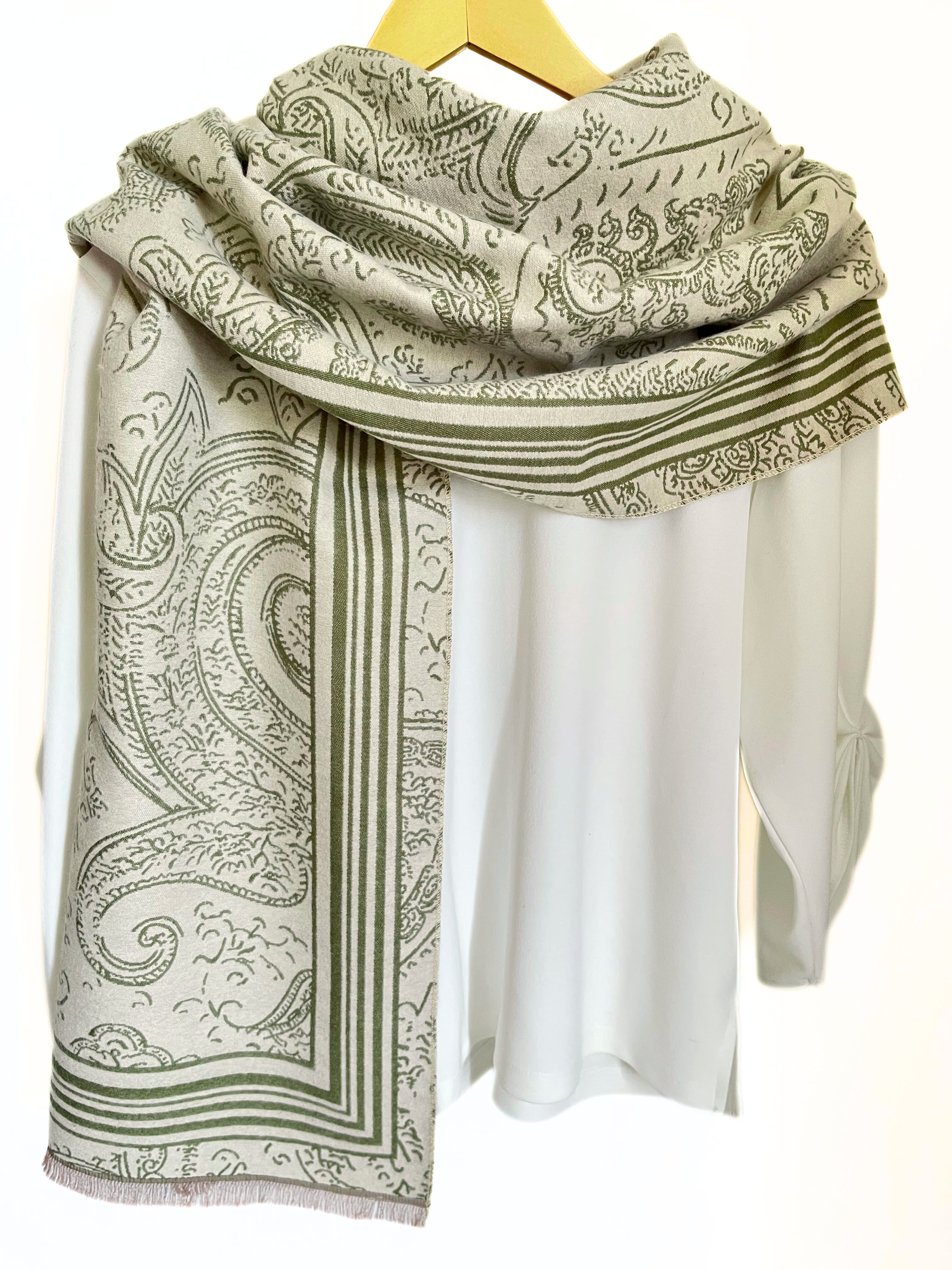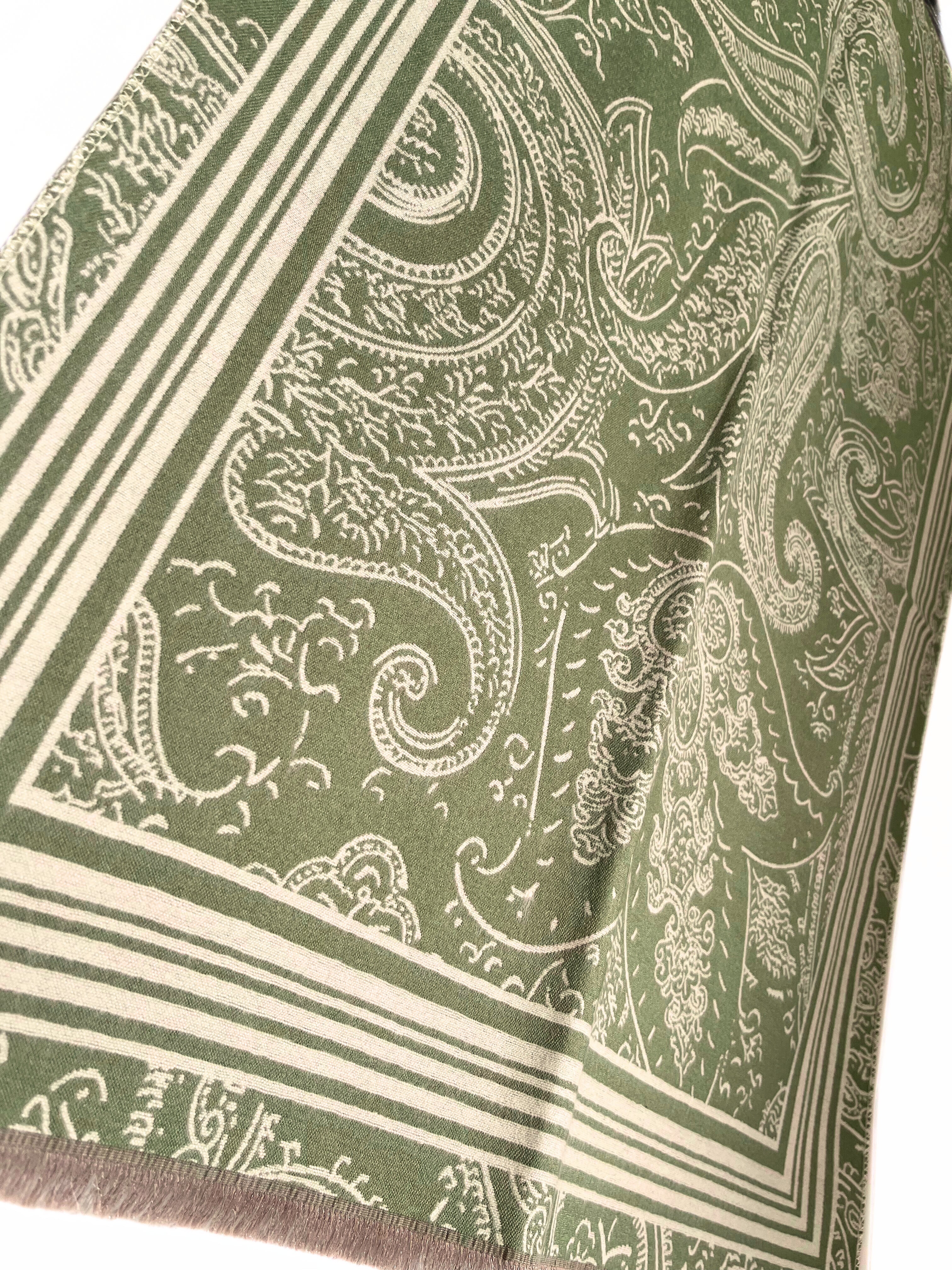 くすんだ緑とホワイトベージュが優しい色合いで、ペイズリーの柄で落ち着いた雰囲気に。