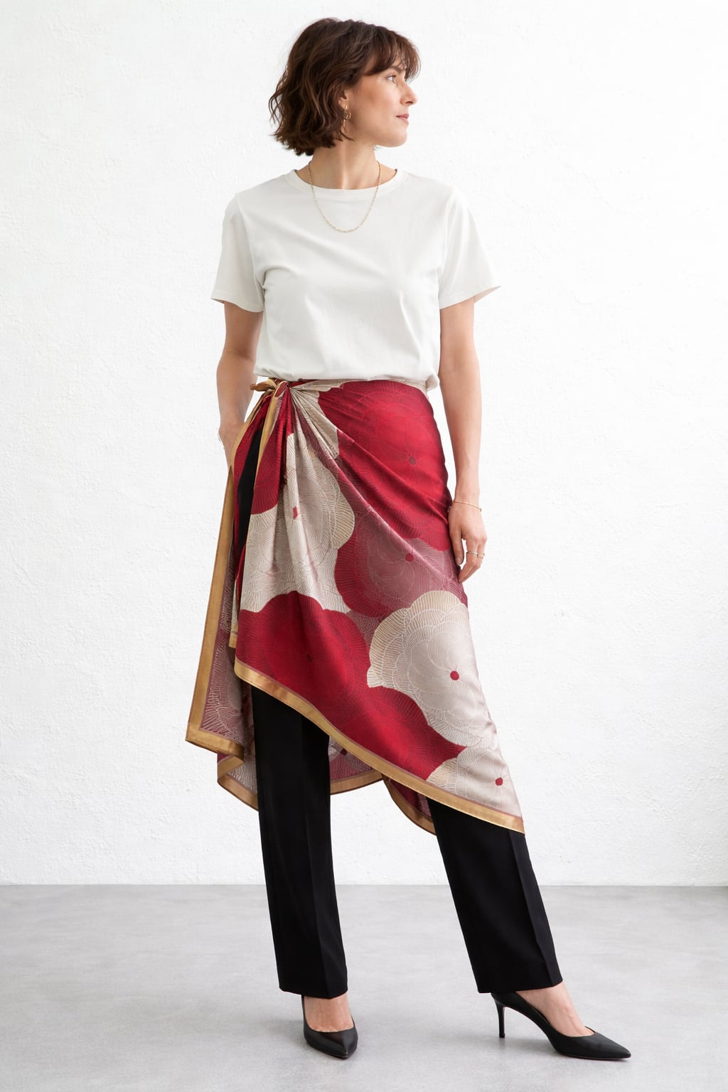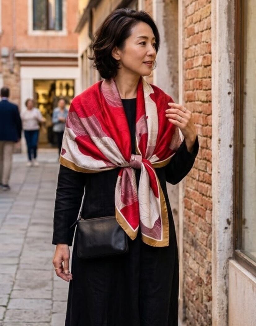 シンプルなお洋服にサッと一巻きするだけで華やかになります。