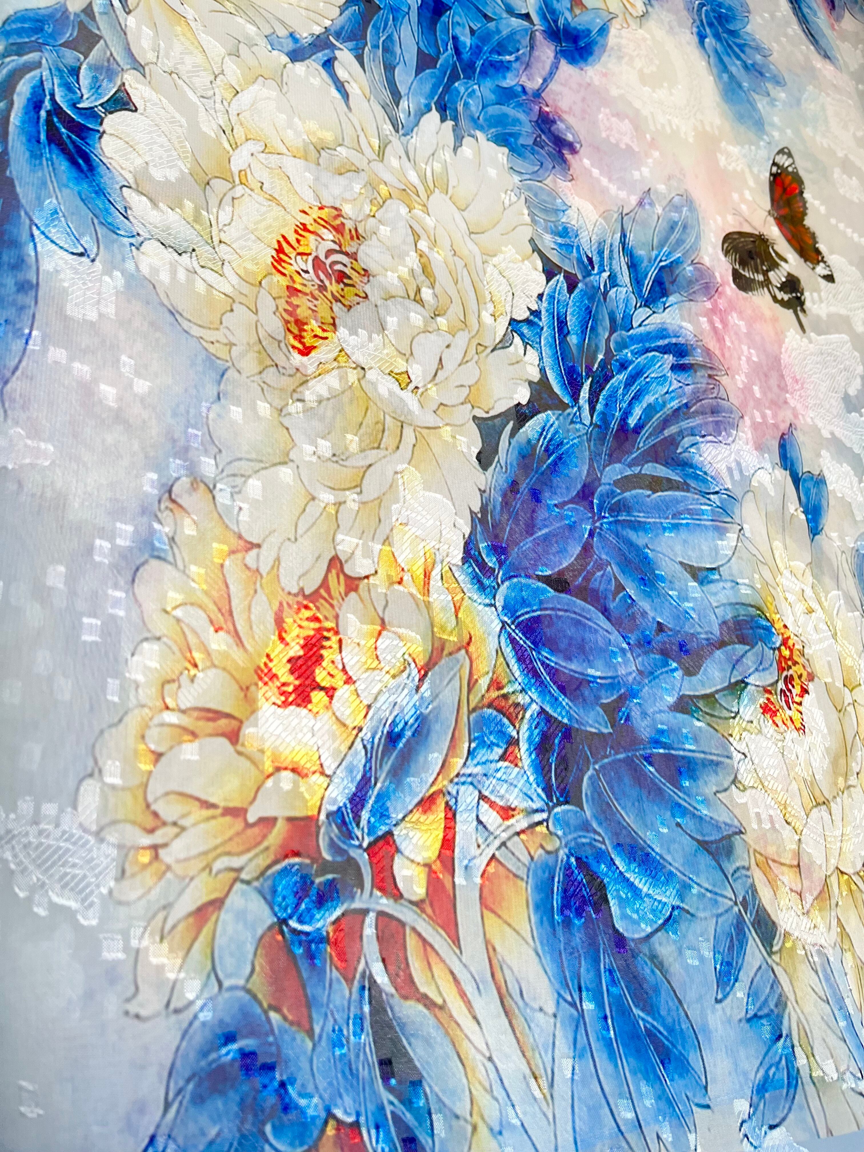 白と青を基調とし、牡丹と蝶が舞うデザイン。